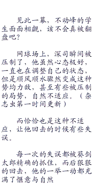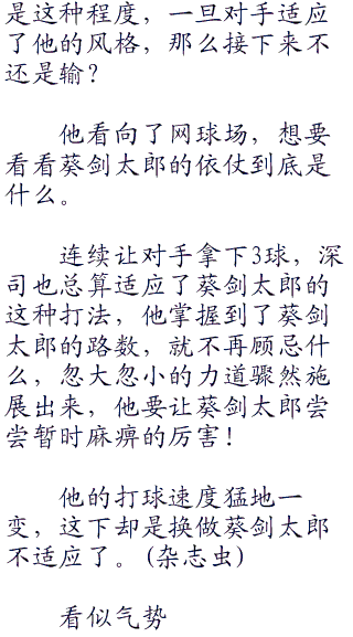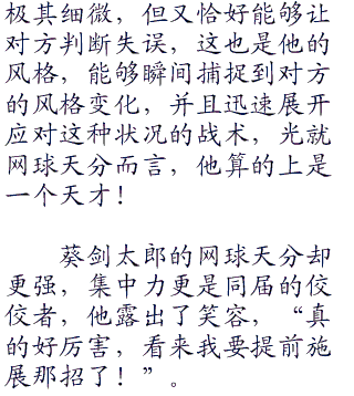 葵剑太郎却是没有什么压力,这局又是他的发球局,他先是缓缓闭上眼,似乎也是在调整状态,而后猛地睁开眼,精光一闪而逝,动作、气势与之前都截然不同。