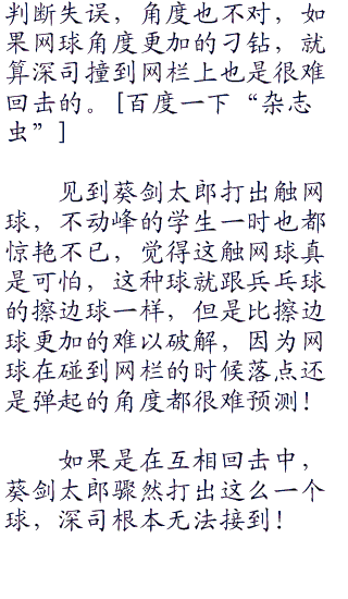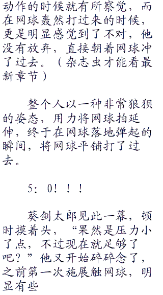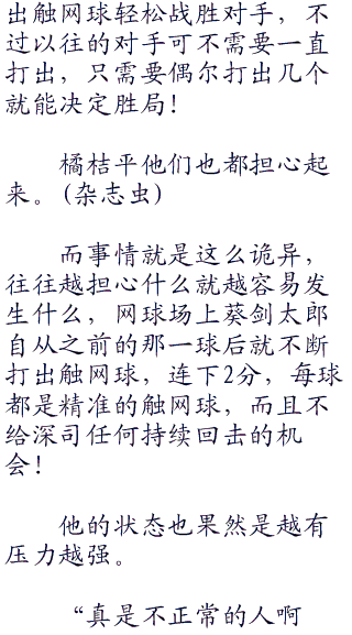 葵剑太郎这次面对这球没有放弃,而是认真的盯着网球,嘴里碎碎念着什么,要是靠近的话,到是隐约能够听见女生、不要之类令人摸不着头脑的话语。