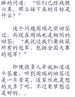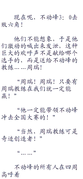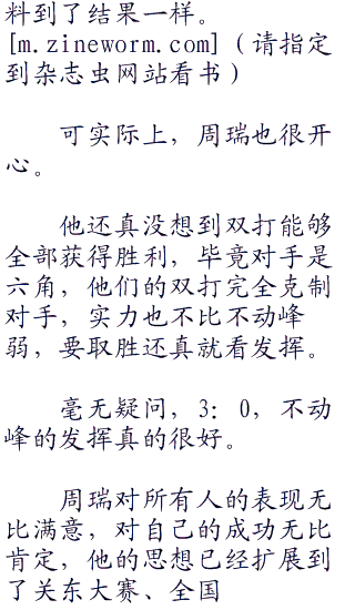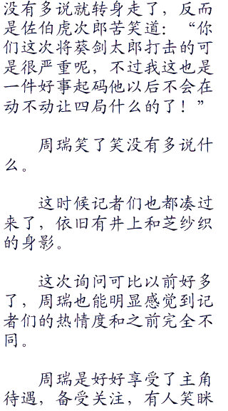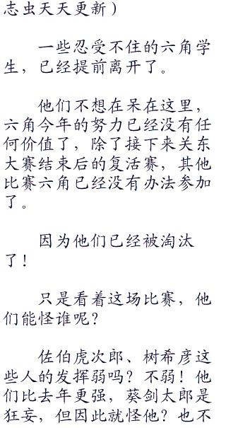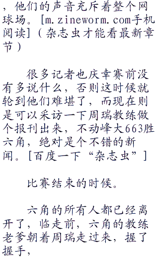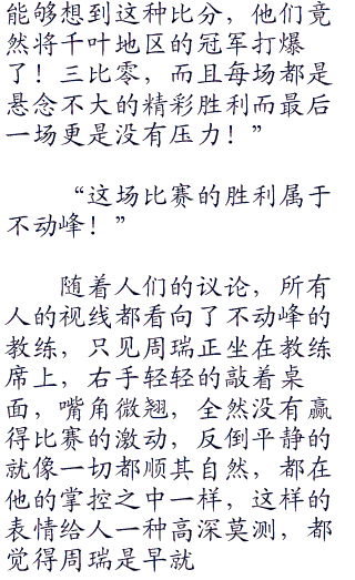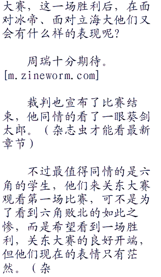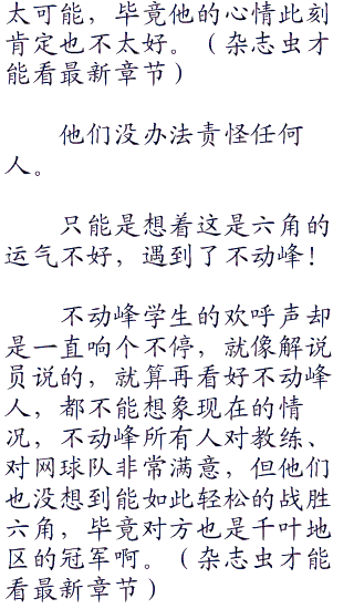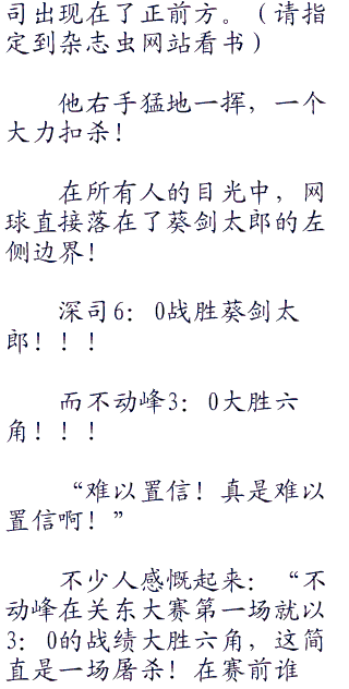 比赛会场的解说员说道:“……葵剑太郎要为他的嚣张付出代价了,在面对深司让四局这种做法明显是太过轻敌了,也高估了自己,他的表现与自己的嚣张完全不符,怎么说对手都是不动峰啊,他们的教练可是奇迹创造者!”