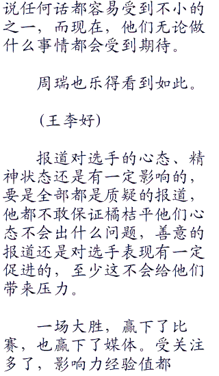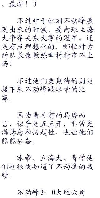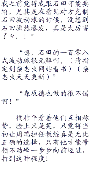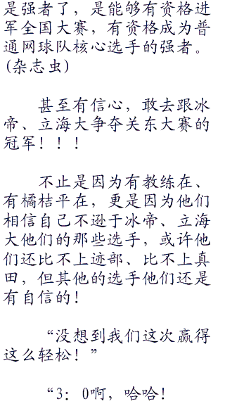但现在他们觉得之前的怀疑真是不应该,教练做的就是绝对正确的,他们每一个人都有独当一面的实力,3:0大胜六角就是事实,之前那些怀疑只是他们对自己的信任值却不够,而现在他们真的相信自己、每一个人都