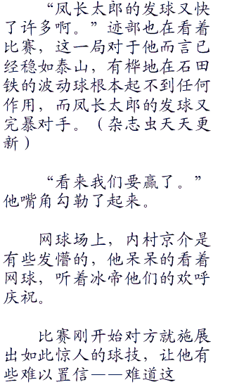 “这球的速度和感觉怎么好像是不二周助的消失发球啊!”森辰德瞪大了眼睛说道,很快又摇头反驳,“又好像是神尾的音速球。”