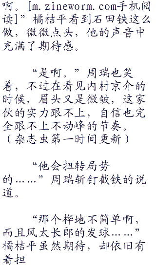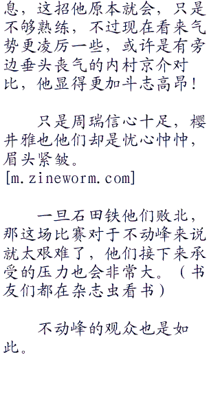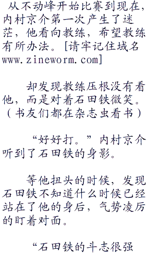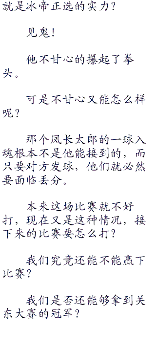 第二双打开始的时候,冰帝的助威声更加巨大了,惊人的呐喊声犹如巨浪一般,一波接着一波连绵不绝,让人有些窒息,也表明了冰帝的态度——这场比赛,绝对要比你们想象中的要困难!