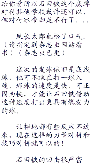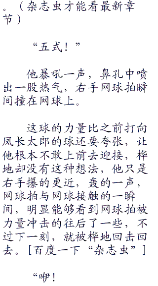 血腥的牙齿、恐怖的身体,想要撕碎他们,狂暴的力量让凤长太郎心头一颤,有那么一瞬间他甚至都忘了要怎么回击这球,起了躲避的心态……