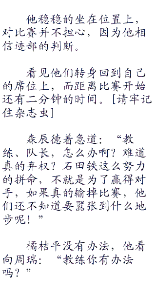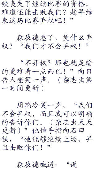 迹部盯着周瑞,也在看着石田铁,“你的身体难道就比桦地好多少?我看弃权的是你们才对,你目前还能在打出波动球?而内村京介还能击败阿凤不成?”