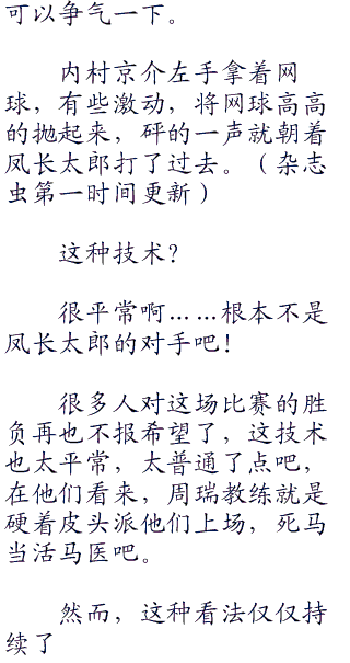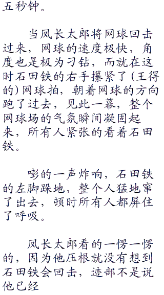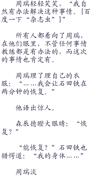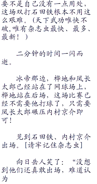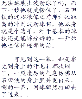 迹部自认为能够眼力可以洞察一切,但他真是有些小看周瑞,或者说小看石田铁了,周瑞很清楚石田铁跟桦地对拼的确是两败俱伤的局面,因为桦地的体魄真的很强悍,尤其是对方能够复制球技,这就是等于说石田铁在球技上的优势也不占据多少。