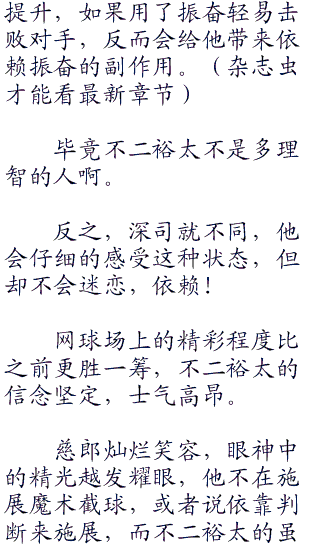 不二裕太虽然疲惫,可他的双眼却极为明亮,他似乎已经忘记了体能,现在的他就跟超人一样,体力充沛!