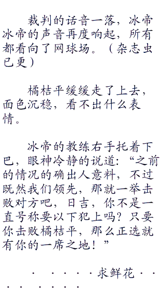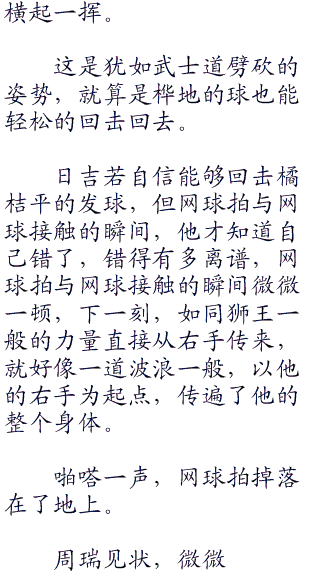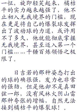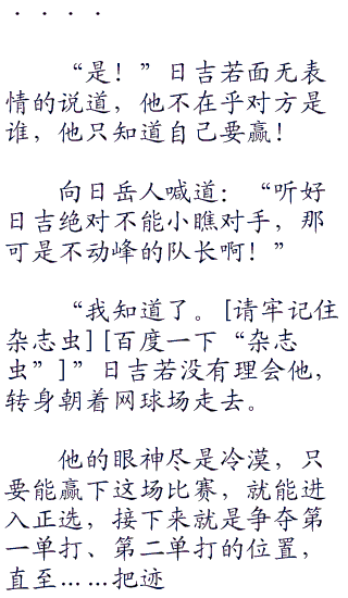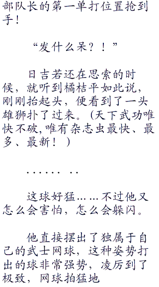 直到比赛到了4:4的程度,他们才回过神来,没错,不二裕太是进步很大,可慈郎也不弱啊,他虽然给人懒散的印象,可一到紧要关头行动却迅速,面对绝境、困难毫不畏惧,反而越挫越勇!