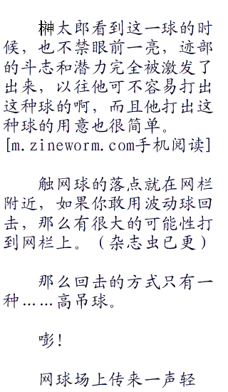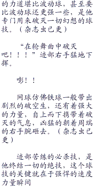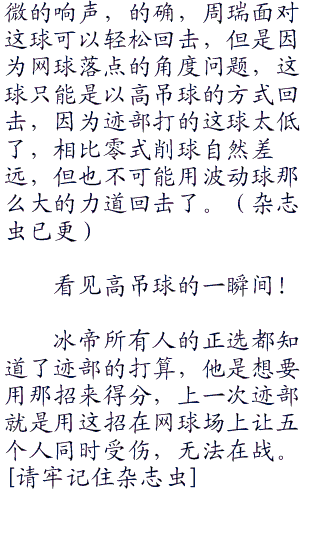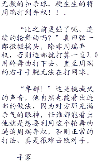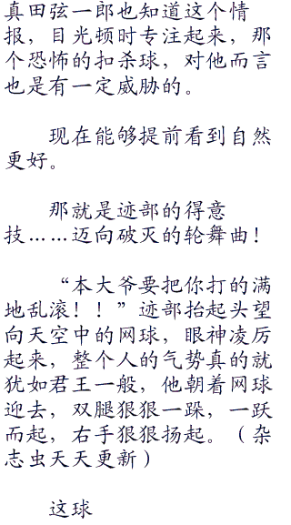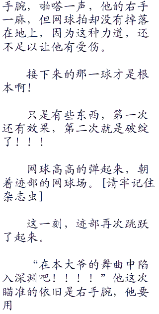 迹部却没有丝毫的畏惧,他迎了上去,双手攥紧了网球拍,他要利用得分,必须要扭转局面,他可的帝王不会输的!