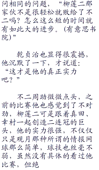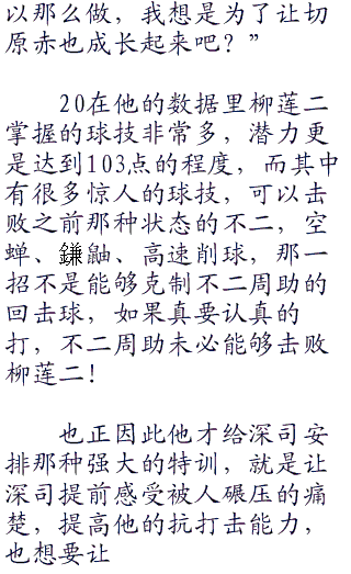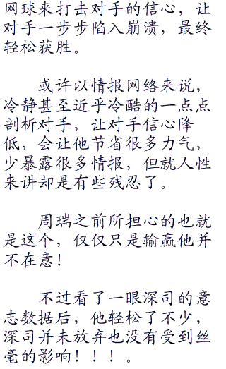 周瑞叹息了一声,“这场比赛只怕会打击深司的自信,如果不是为了让深司真正的成长起来,我到是很想安排你上场的。”