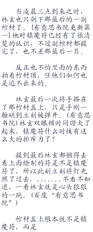 这时候后,他看到在棺木盖上竟然绘制着符篆的纹络。林玄对那些符篆来了兴趣,只是扫了一眼过去“四六三”,却发现不过是镇魂符而已。