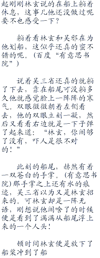 “当时我也是划着一条小船从那条河上过,你们知道我这个人懒的很。所以当时我就看到有着一只苍白的手掌扒在了船边上,我往下面看的时候,那是一张!”
