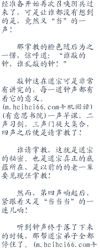 数百阴兵在这时全都朝着那帮道宗弟子厮杀而去,而那道宗的掌教天师却在这时候怒吼道:“敲钟!”