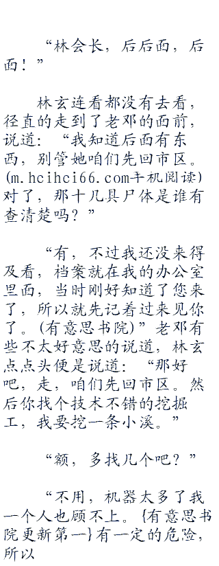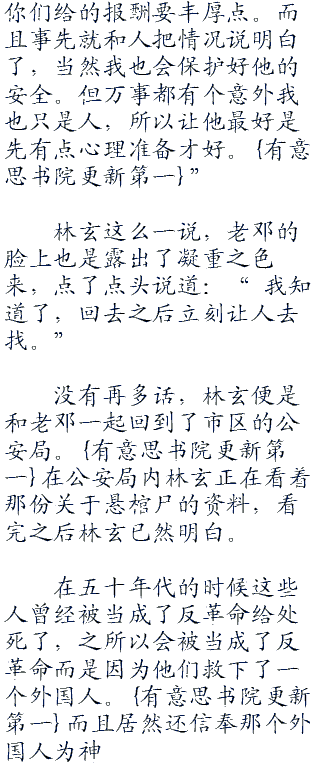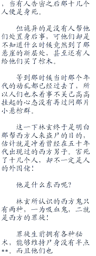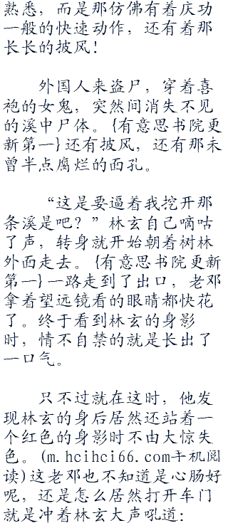 林玄拿着手电筒朝着树林里面看了看,那只喜袍女鬼依旧站在不远处呆呆的看着。只不过下一秒就有一道身影将他给掳走了,那道身影让林玄似曾相识的感觉。倒不是说他的样子让林玄