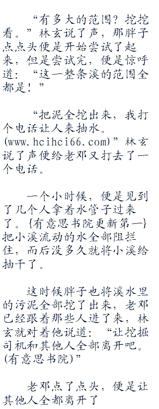 不过林玄倒也不是骗那胖子,没多久车子终于到了那个小溪边。胖子停下了挖掘机,此刻已经天色全黑了下来,胖子问林玄:“挖哪里?’