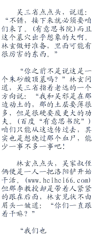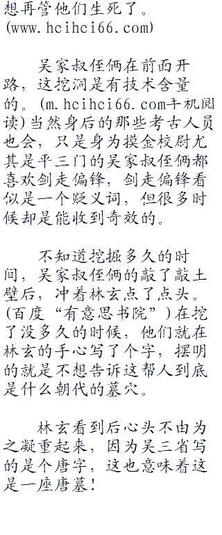 一直又挖了一个多小时,吴三省已经靠在挖掘之处了。等他看到差不多的时候,便是说道:“行了,不用再挖了。”