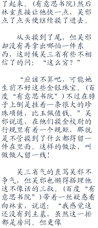 吴邪淡淡一笑,便是伸手进了那棺材里面。一摸,便是先拿出了一块玉佩来。将那玉佩丢给了林玄之后,便是跟着继续摸进了棺材林玄。