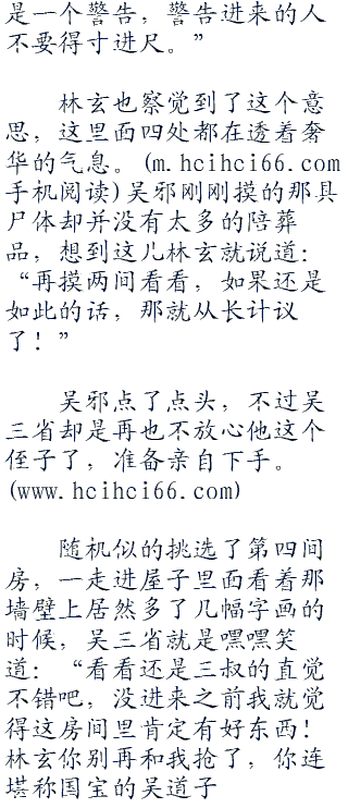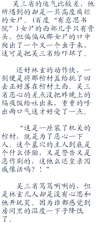 吴邪嘿嘿的笑了笑,说:“可不仅仅是那样,她好像一点也没有腐烂,而且肌肤似乎也保存的很好!”