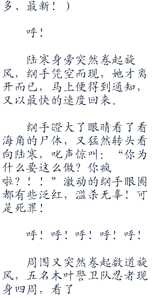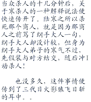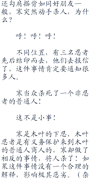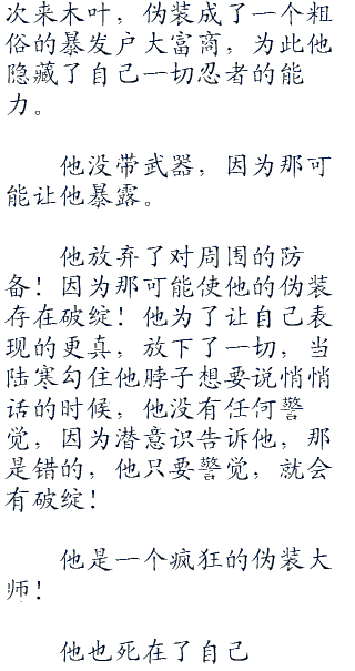 角海很自信!甚至可以说是自负!近十年来,他已经是雨隐村最强的斥候!他的强大不在于他的战斗能力,而是完成任务的本事!刺探情报!痕迹分析!线索推演!伪装欺诈!下毒解毒!在整个雨隐村,这些能力他都是最强的!