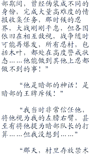 “零一三”“他是雨之国王牌斥候!是深受山椒鱼半藏器重的顶尖斥候忍者,虽然我不知道他现在拥有什么样的战斗力,甚至他可能没有战斗力,但我知道,他不仅仅是一名忍者,更是雨之国的高层掌权者<div class="divimage"><img src="<div class="divimage"><img src="<div class="divimage"><img src="<div class="divimage"><img src="<div class="divimage"><img src="<div class="divimage"><img src="<div class="divimage"><img src="<div class="divimage"><img src="<div class="divimage"><img src="<div class="divimage"><img src="