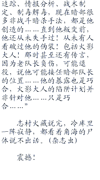 “自己人、敌人、忍兽……有些是暂时冷藏,解剖后销毁,有些则是长时间冷藏,用于一些实验。”猿飞岳洵解释道。