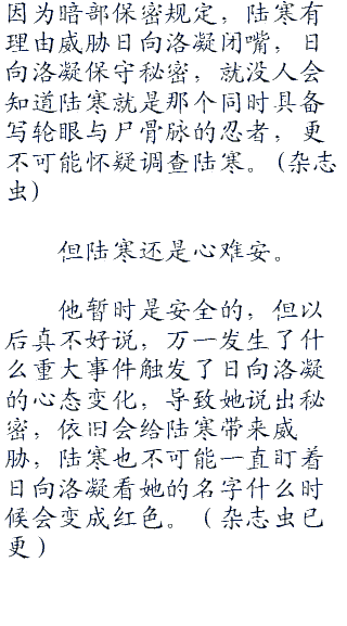 碍于暗部的保密规定,日向家高层将那夜的情况告诉火影,向火影求证是否真的有同时掌握写轮眼与尸骨脉的忍者,无论火影是否回答,他不回答,14或者他说没有,日向家高层也都不会将此告诉日向洛凝。