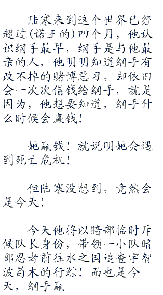 “记住,这次任务你务必要小心!”纲手正对陆寒千叮咛万嘱咐,“这次暗部一共派出了四个小队追寻宇智波苟木,你所负责的小队,主要作用是追踪定位,一旦发现宇智波苟木,马上通知其他小队,击杀的事不用你负责!”