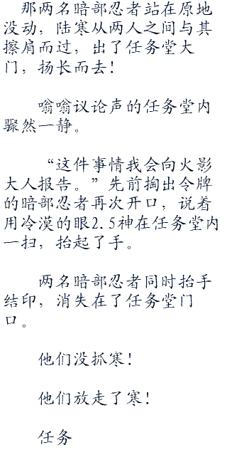 这里可是任务堂!宇智波族这十几个忍者今天来任务堂找陆寒麻烦,也就是想要对陆寒冷嘲热讽羞辱一番,没有要动手的准备,因为他们不敢!