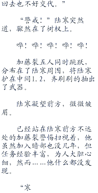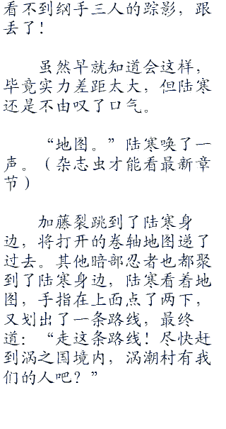 “可是,纲手大人不是说……”这次开口的是加藤裂,他已经恢复情绪,声音有些急,“再说,我们的任务是去水之国,虽然走涡之国的路线也不是不行,可刚刚寒光大人说是要去帮纲手大人他们,这……”