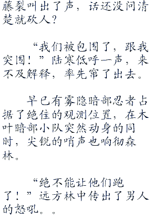 森林里多了一片空地,树木被击毁了一片,断裂的树身倒在地上,上面还燃烧着火焰,周围一片焦灼。战斗很好解决,暗16部四名上忍,包括实力紧比加藤裂稍低的加藤锋,他们的对手虽然也是上忍,却根本不是对手。