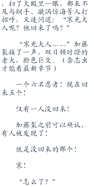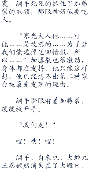 一旁突然卷起旋风,一位身穿华丽宽袍的威严中年男人现身,包括纲手三人在内的所有人同时恭敬招呼:“惊海大人!”