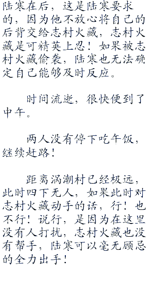 陆寒不确定志村火藏什么时候会对自己动手,也不确定应该什么时候对志村火藏动手,但至少他得保证,周围不会有其他人打扰。