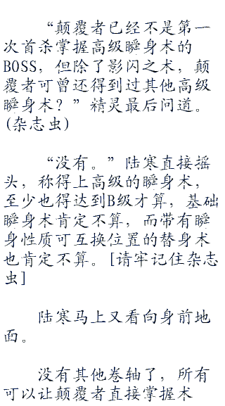 “水分身之术,是极为高明的c级忍术,体术怪力,对天赋要求极高并实用性极强的术!这些两种术,对颠覆者都曾有过很大帮助,但颠覆者3665并未意识到掉落上有特殊,而影闪之术,朝田九和本身就掌握,实际上瞬身类的高级忍术,在各种掉落物品中,属于爆率最低的一种,哪怕是首杀boss,哪怕他已掌握,没有特殊掉落,也很难掉出。”<div class="divimage"><img src="<div class="divimage"><img src="<div class="divimage"><img src="<div class="divimage"><img src="<div class="divimage"><img src="<div class="divimage"><img src="<div class="divimage"><img src="<div class="divimage"><img src="<div class="divimage"><img src="<div class="divimage"><img src="