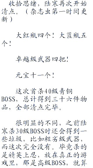 “颠覆者首杀20级青铜boss蓟雾,完成20级阶层首杀,触发特殊爆率,掉落b级体术·怪力。”