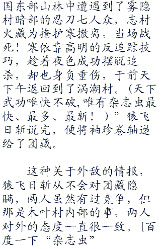“志村火藏为了保护寒,战死了。”猿飞日斩道。