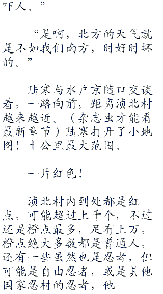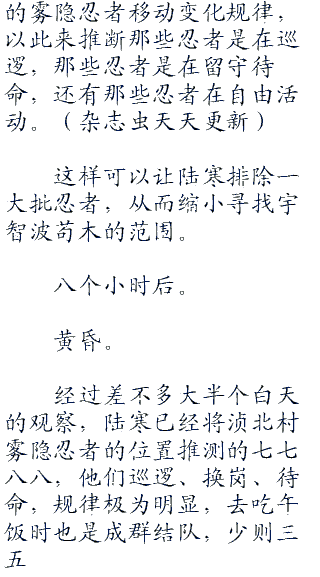 陆寒是在感受到漩涡惊海威胁后的当天下午离开涡潮村的,五天后到达水之国,只有便一路追寻木叶暗部忍者在任务时会留下的特殊记号,又用了六天时间,才将已经聚集在一起的几支木叶暗部小队找到。