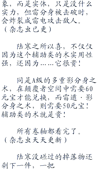“这样……”陆寒又有点失望,又是a级,杀了50级白银boss,竟然没掉s级的术!只能说是运气不好“四四七”,因为掉落都是遵循概率原则的,就算陆寒杀血雾掉落s级术的概率有90%,那还有10%的可能性不掉。