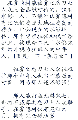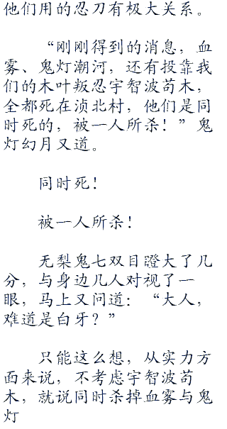 雾之忍刀七人众已经回到雾隐村数天,他们并未去寻找“寒光”,因为他们只有七个人,水之国这么大,仅凭他们七个人无头苍蝇一样去找,能找到才怪。