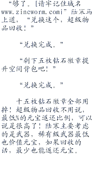 空间百倍升级:空间背包面积扩大百倍,附带秒自动回收掉落物属性,需5枚钻石徽章。