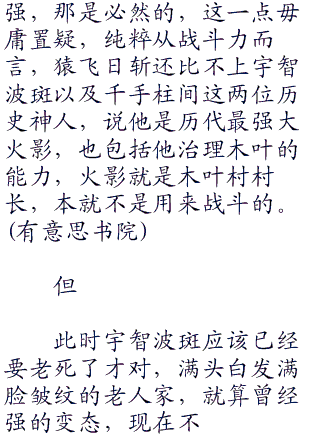 猿飞日斩是那种历史必然出现的至强者,也就是说,每一个时代,都会出现如他一般强大的人,就像是一定数量的下忍中,必然会有人成为中忍一样,忍界的忍者基数在这里,一群天赋差的人中,肯定要出现一些天赋中等的,一些天赋中等人里,则会出现天才,所以猿飞日斩这种强者的出现,是一种必然。(..)