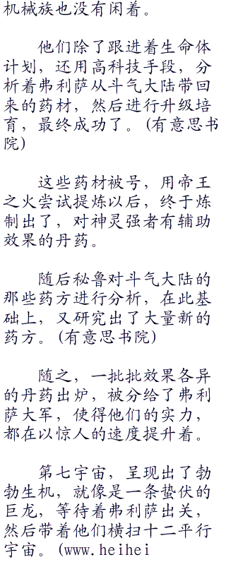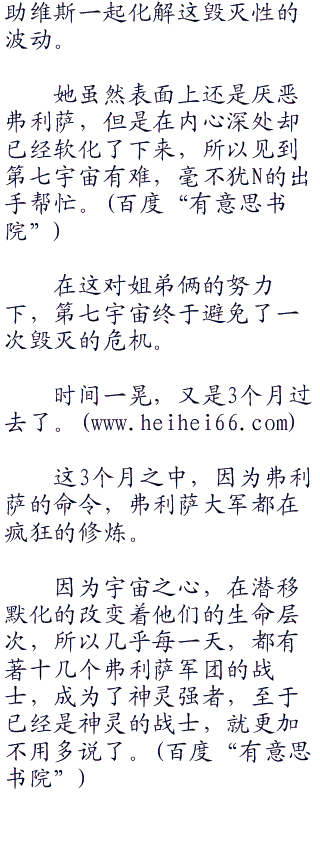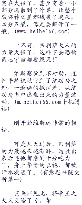 接下来,弗利萨把维斯和秘鲁全部叫了过来,盼咐下去,让他们开始准备攻打第五宇宙的事情,然后回到了破坏神之星的练功房,将帝王之火交给了芭朵斯,开始了闭关。w ww h eihei6 6 co br />