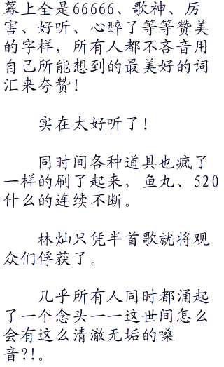 寥无几,女的一大堆。斗鱼平台则更加过分了,男性唱歌的主播甚至都有点绝迹了,这时段的林灿,异军突起,绝对是独一无二的头