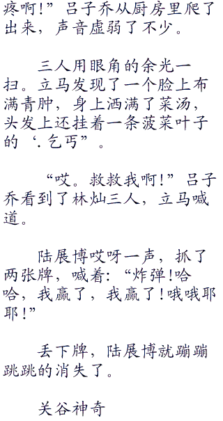 在将吕子乔成功端下后,曾小贤整了整衣领,得意说:“怎么样?哼,我的闪避技术很不错吧?哈哈,也不看看我曾小贤是什么人,我可