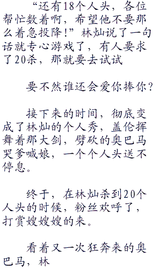 这一场比赛林灿杀了大约有十五个人头,把猴子压制的连补兵都没办法了。