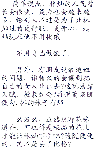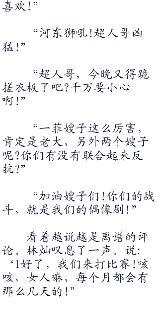 林灿乐了,他幸好长了记性,把自由说话,改成了按键说话,要不然这一屋子的女人可真要翻天了。