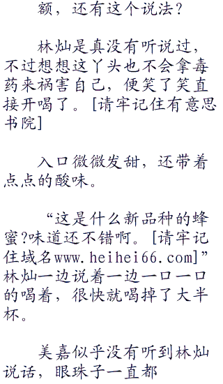 “林总,我听人家说,这蜂蜜水啊就得趁热喝,而且最好还是一口都喝掉,因为这样能够让身体更好的吸收掉蜂蜜中的营养,对身