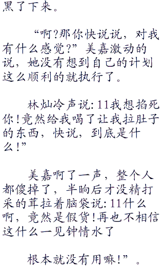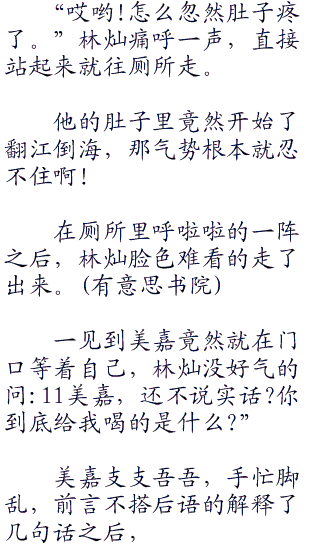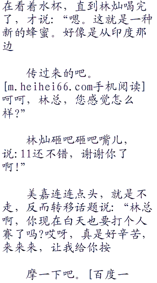 11晦,没事。刚才我见林总你吃完饭没喝水,这不就给专门送来了嘛!林总,来喝杯蜂蜜水吧,对你的嗓子有好处的。”美嘉满脸