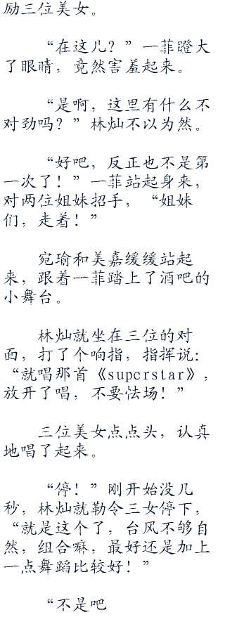 简单的介绍之后,由一菲领头唱了一首《superstar》,虽说是一首老歌,但是有美女陪衬,唱什么已经不重要了。