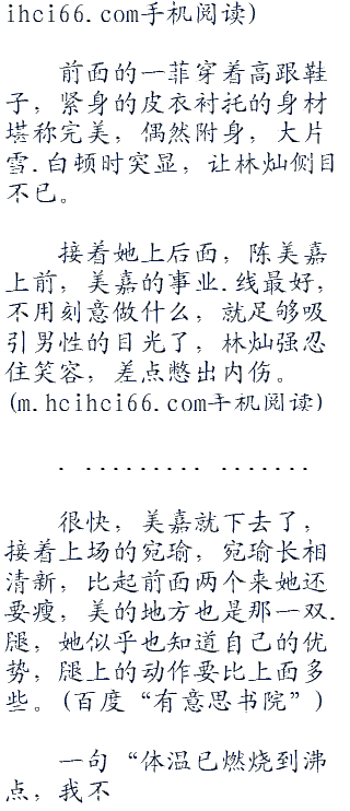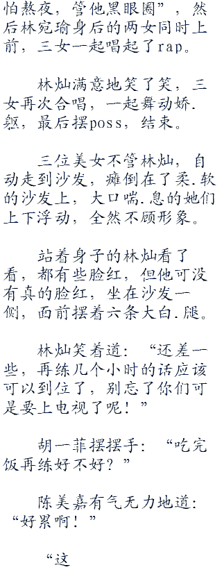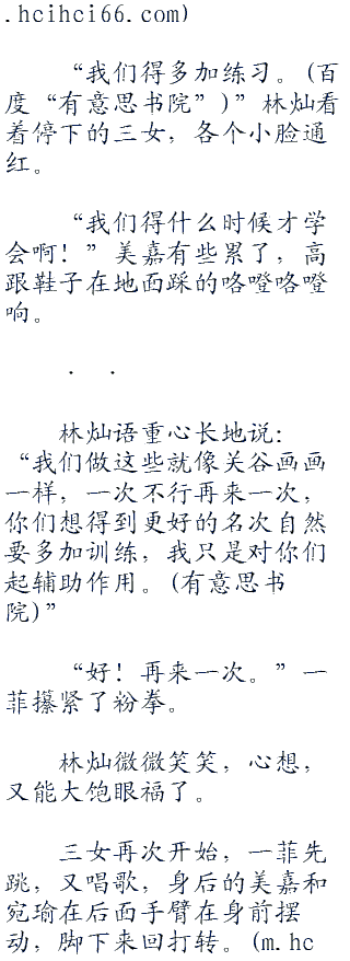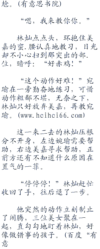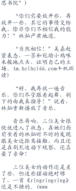 在三位美女同意下,林灿找了一段视频,准备放给她们观看,一边看,一边学,算是初学者练习舞蹈最快的捷径了,再说不是还有林灿这个表演大师在旁“亲手”指导嘛(嘿嘿,大家都明白的)!
