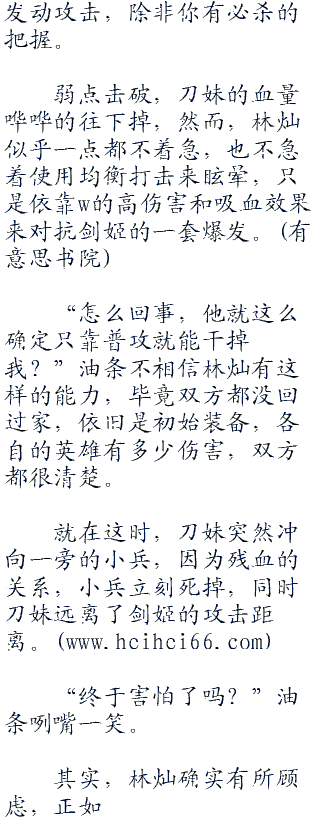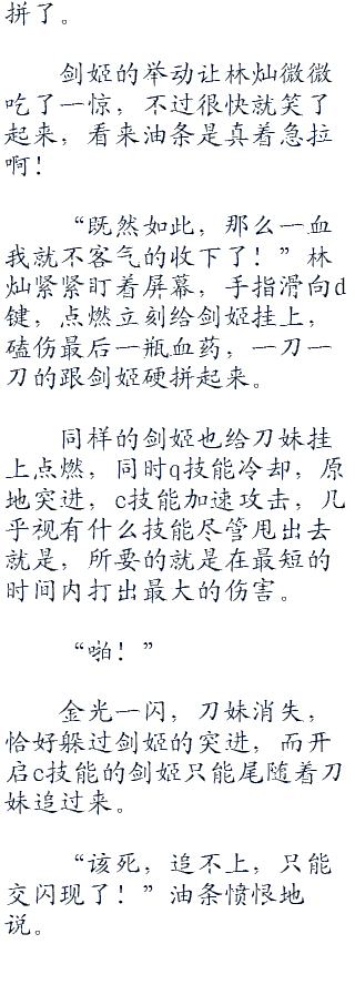 明知这一点,林灿打得更奔放了起来,直接压着兵线就是不让剑姬补兵,一副“你敢上来,我就打你”的架势。
