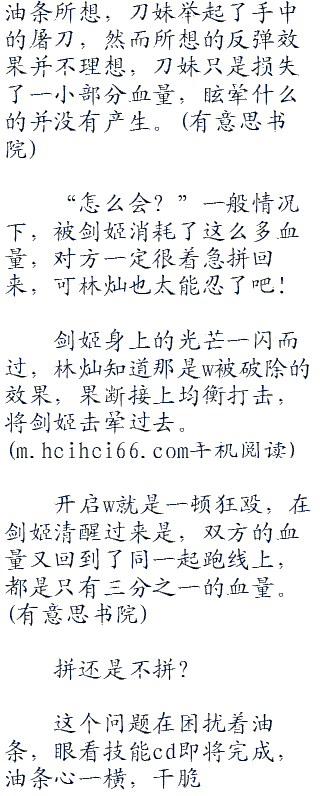 “当!”依旧是均衡打击,血量较少的刀妹利用e技能的特性,将剑姬击晕,开着w,刀妹的攻击成倍的增长,对着剑姬就是一顿猛打。